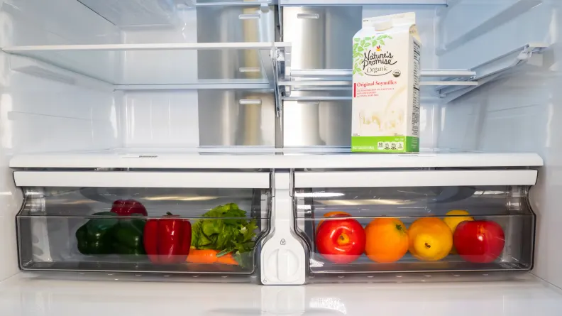 • Samsung’s design aesthetic, which includes our test model’s family-friendly fingerprint-resistant black stainless steel finish and four-door layout. • The door-in-door setup, which Samsung calls "Food Showcase," makes it easy to grab favorite foods without opening the main doors and letting cold air out. • Consistent temperature in the fridge and freezer to preserve food well. We measured the average fridge temperature at 38.6°F, which is perfectly safe, though you could set it down a degree to the optimal 37°F. The freezer averaged -0.8°F, and anything under 0° preserves food very well. • Bright LED lighting, which illuminates the food in every corner. • A built-in water pitcher that fills automatically with filtered water and includes an infuser for fruit or tea bags. • The FlexZone cold drawer in the middle, offering four temperature settings to allow you to adjust for preserving deli, soft drinks, meat, and wine. • An ice and water dispenser that’s tall enough to fit a water bottle underneath, a great convenience when you need a quick refill. • Good energy efficiency, with an estimated annual running cost of $44. • Remote monitoring and control using WiFi and Samsung's digital assistant, Bixby.